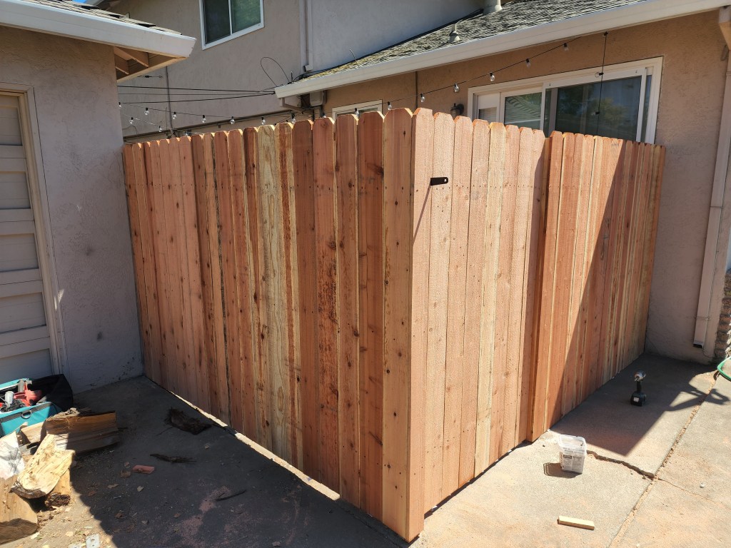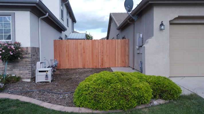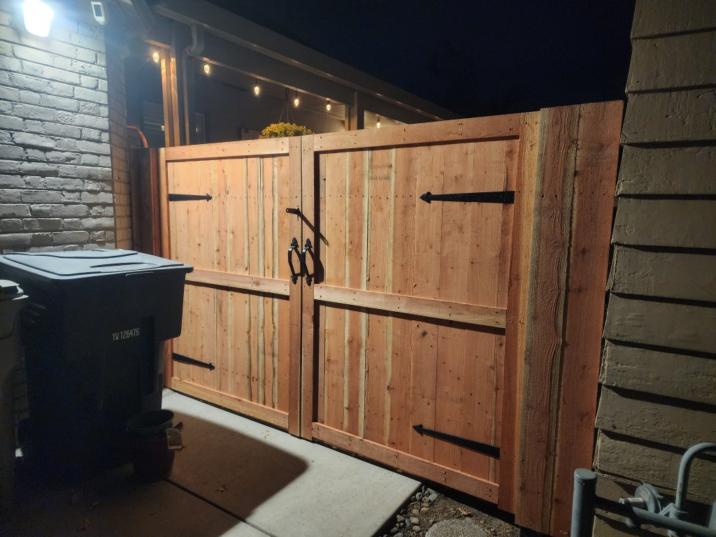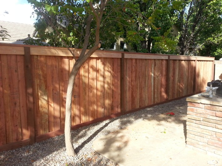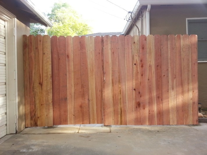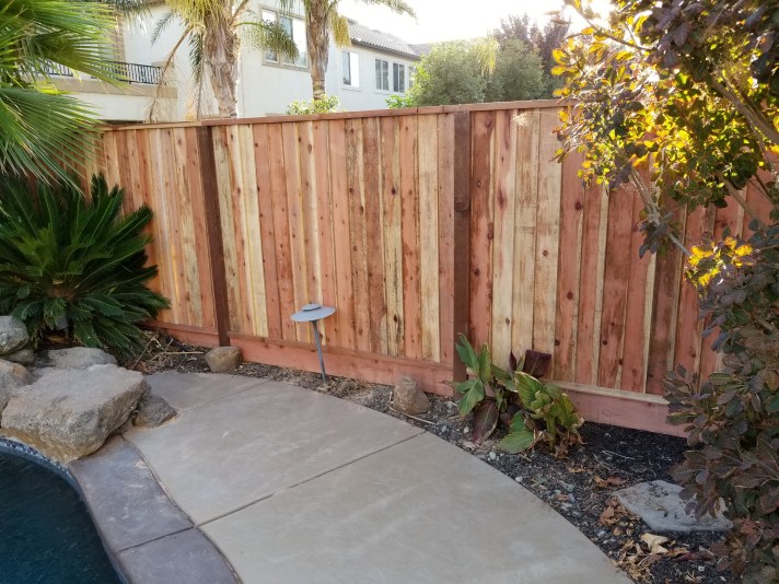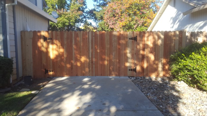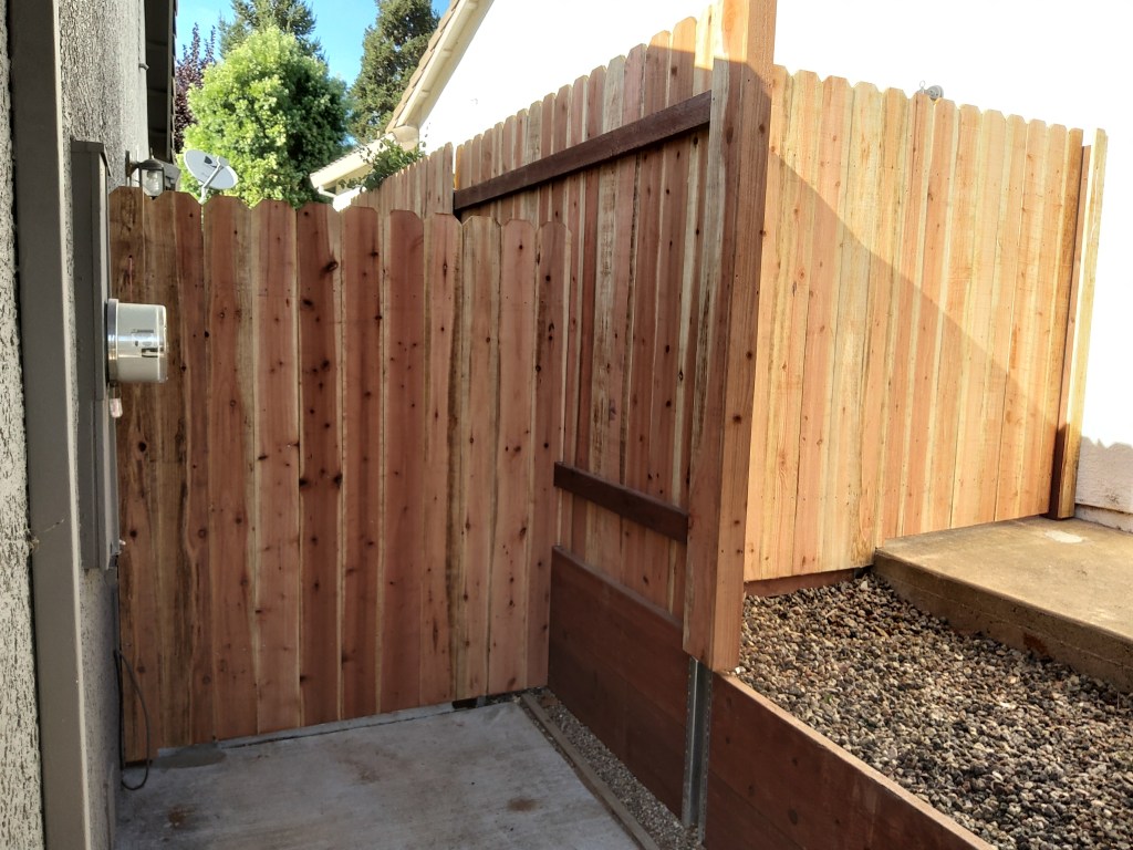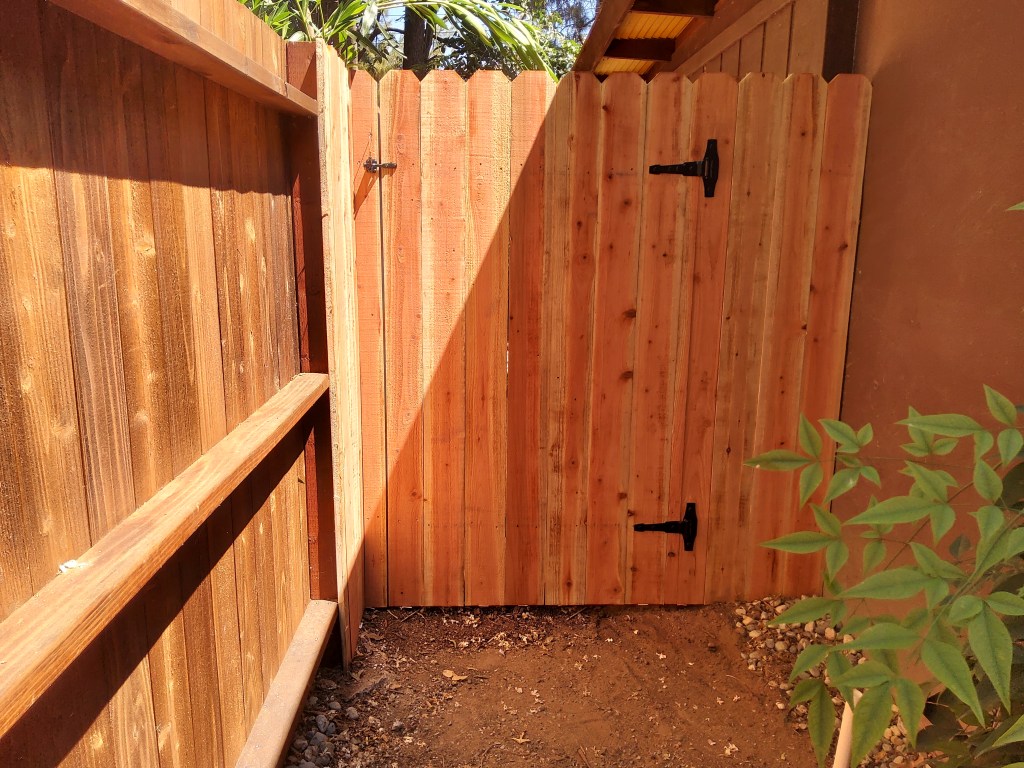 Custom Redwood Double GateMetal posts, 3 redwood 2x4s, & 1×6 dog-eared picketsRedwood cap, trim, and pickets with metal postsStandard cost efficient fence Horizontal staggered pickets with metal postsCustom designPressure-treated 2×4 rails on metal posts and redwood 1×6 dog-eared pickets Redwood 1×6 trim on topOversized single swing gate Matching custom fence designStandard double gate Standard fence with redwood 1×12 kickboardsPressure-treated 4×4 posts & 2×4 rails with redwood 1×6 dog-eared pickets Standard fence with metal posts on top of a 2ft retaining wall Standard gate with hinges on the outside due to pool regulations (gate swings out)